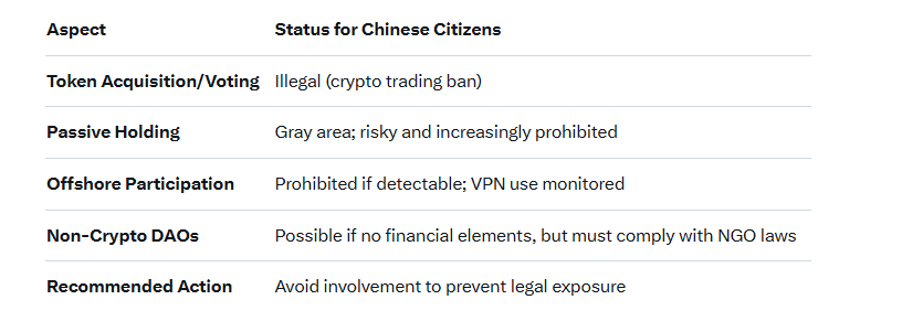 Prohibited Activities by Chinese citizens : Joining a DAO typically requires acquiring governance tokens (e.g., via purchase or airdrop), which violates the 2017 ICO ban and 2021 trading prohibitions. Voting or contributing to DAO decisions using these tokens constitutes “virtual currency-related business activities,” explicitly banned under the 2021 notices.